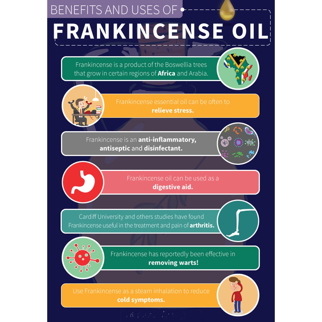 Extremely good for relaxing muscles clearing the mind and generally making you feel more balanced and tranquil. Natural cold or flu medicine. When used correctly frankincense oil is like a cleanser a lotion and a perfume all in one.